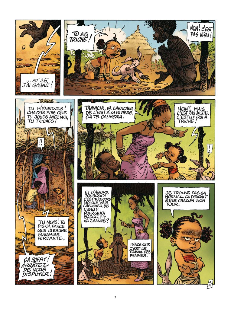 Un peu plus loin dans l’histoire, Tannicia finira par s’échapper de ses ravisseurs grâce à son fort caractère, mais se retrouvera bien malgré elle propulsée dans un univers inconnu peuplé d’animaux de la jungle anthropomorphisés. Et voilà, encore un. Le personnage principal est noir, et se retrouve confronté à des lions, des singes et des crocodiles. Encore une fois, je me suis dit: « Bon, ok, ça se passe dans la jungle, passons… » Mais je n’ai pas pu m’empêcher d’être agacée. Parce que ce n’est pas vraiment la jungle. C’est un monde imaginaire inventé par l’auteur, un monde qui n’existe même pas dans la réalité des personnages, qui est parallèle à leur univers. De tous les mondes imaginables qui auraient pu être inventés, c’est celui-là que les auteurs (2 Blancs et 1 Algérien) ont choisi. Ouf.