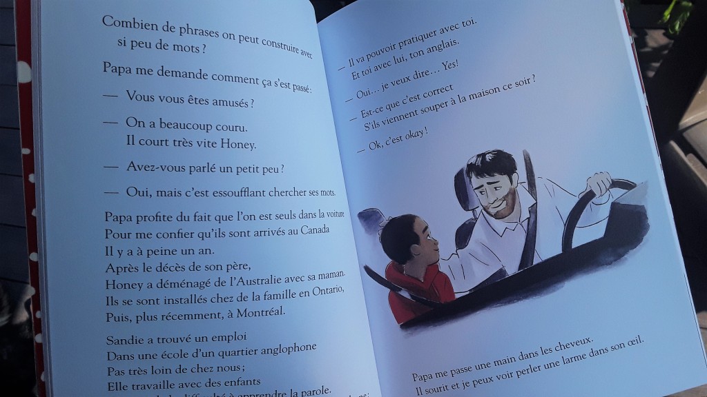 Honey et Ketchup, ce sont les surnoms que se sont donnés deux garçons qui ne parlent pas la même langue et dont les parents sont tombés amoureux. Avec une poésie en prose qui fait avancer le récit plutôt qu’elle ne décrit, ce livre étonne par sa limpidité, par ses jeux de mots, et par son accessibilité. Les illustrations de Sabrina Gendron sont douces et lumineuses. Ce livre est un excellent choix pour une exploitation en milieu scolaire au niveau primaire.