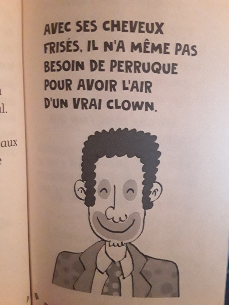 Ça, c’est une femme blanche (l’auteure) qui associe cheveux crépus à chevelure de clown. Si j’ai bien compris, les cheveux crépus sont des cheveux de clowns. C’est bien ça? 😬 Ce genre de représentation me rend en colère et me blesse. Sait-elle que des personnes dans la vraie vie ont naturellement les cheveux crépus? Comment sommes-nous sensés nous sentir en tombant sur ce passage dans son livre?