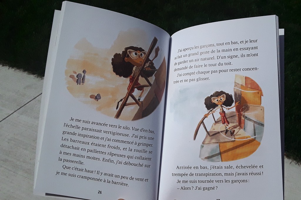 Il y a dans ce livre d’une quarantaine de pages une histoire estivale autour du vélo, de la découverte de soi et du courage. Mais, et il faut le savoir, il y a aussi des passages sexistes. Caroline vient d’arriver dans un nouveau quartier et souhaite rapidement être acceptée de ses camarades pour se faire de nouveaux amis. Elle a donc repéré dans la cours d’école les deux garçons les plus populaires et respectés, et fera tout pour tenter d’intégrer leur groupe. Toutefois, Hugo et Karim sont tout de go réticents à accepter Caroline: Il n’y a plus de place dans leur club et certainement pas pour une FILLE (p.13)! Tout au long du roman, il y aura ces petites flèches lancées ici et là comme quoi les filles sont moins que les garçons: moins courageuses, moins intéressantes, moins digne de respect. Ça commence en page 6 où on mentionne que « le dernier arrivé au petit bois est une fillette! », comme si être une fillette était une insulte, un statut à éviter à tout prix. Puis, quand les garçons mettront Caroline à l’épreuve de monter au sommet d’un silo, d’en faire le tour et de redescendre (persuadés qu’elle se dégonflerait), la jeune fille les épate par son courage. Mais jamais les garçons ne l’admettront, allant même jusqu’à minimiser son exploit (« ce n’était pas vraiment dangereux, même [mon petit frère] aurait pu le faire! » (p. 28)) Ainsi, les efforts et succès de la jeune fille ne sont jamais suffisants aux yeux des garçons.