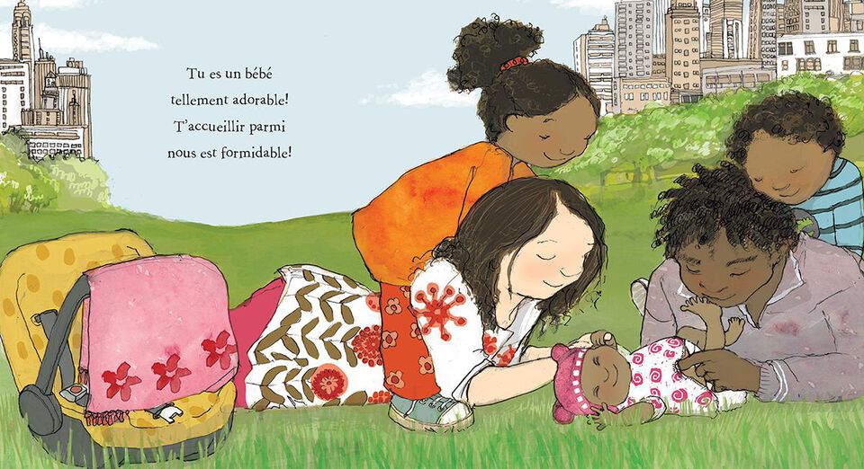 Mais attention! Petit bémol lorsqu’on compare les couleurs de peaux foncées à des aliments (chocolat, canelle ou miel), mais qu’aucune comparaison n’est faite pour les peaux blanches. Cela pose les peaux blanches comme étant la norme n’ayant pas besoin de qualificatifs pour les distinguer des autres, et les peaux brunes comme la variation devant être justifiée. Pourtant, dans la version originale anglaise, le texte inclut pourtant une comparaison des peaux claires avec des pêches et de la crème. Que s’est-il passé au moment de la traduction?? Je recommande donc la version originale anglaise et non la traduction française. C’est regrettable, car l’édition française pour la jeunesse parle peu des couleurs de peau et d’identité raciale en général. Une telle erreur dans la traduction de cet album me semble majeure: il s’agit clairement d’un choix de mots qui est porteur de sens. Dommage.